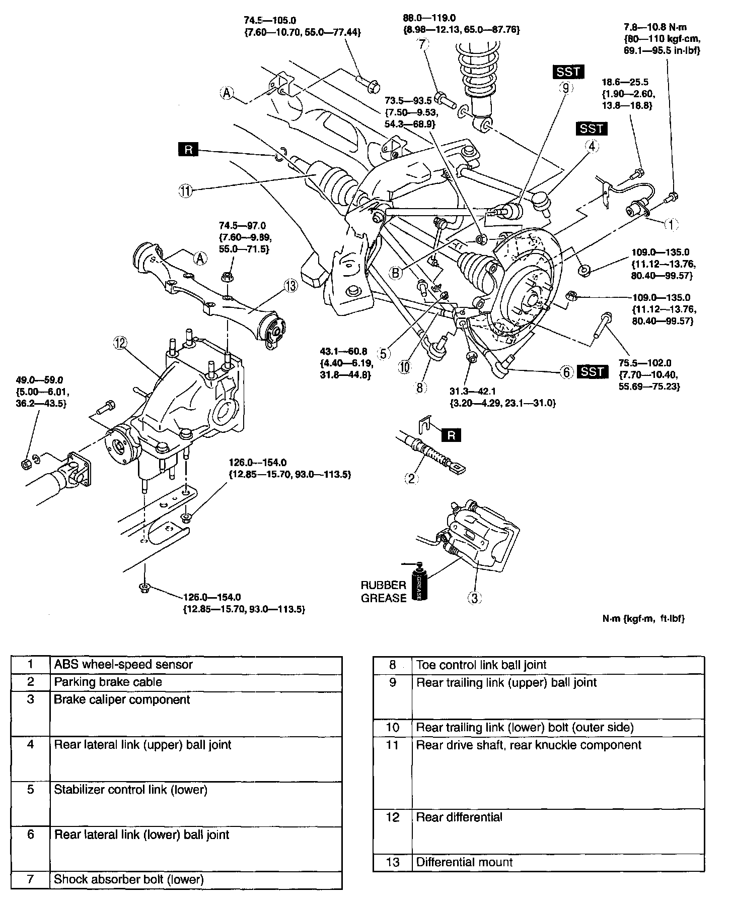 REAR DIFFERENTIAL REMOVAL/INSTALLATIONCaution: Performing the following procedures without first removing the ABS wheel-speed sensor may possibly cause an open circuit in the wiring harness if it is pulled by mistake. Before performing the following procedures, remove the ABS wheel-speed sensor (axle side) and fix it to an appropriate place where the sensor will not be pulled by mistake while servicing the vehicle.