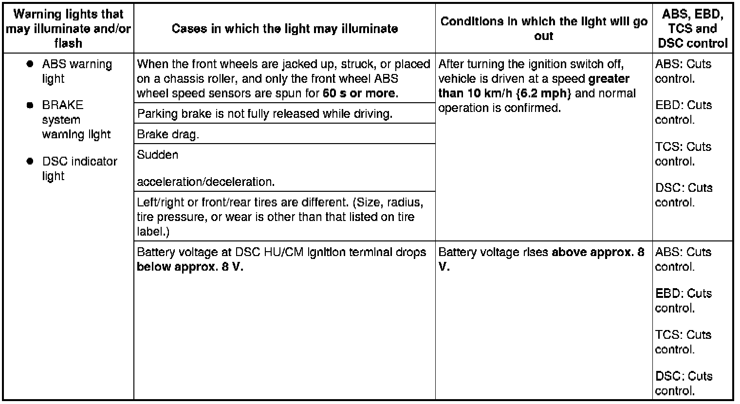 1. The ABS warning light and/or BRAKE system warning light and/or DSC indicator light illuminate even when the system is normal.
