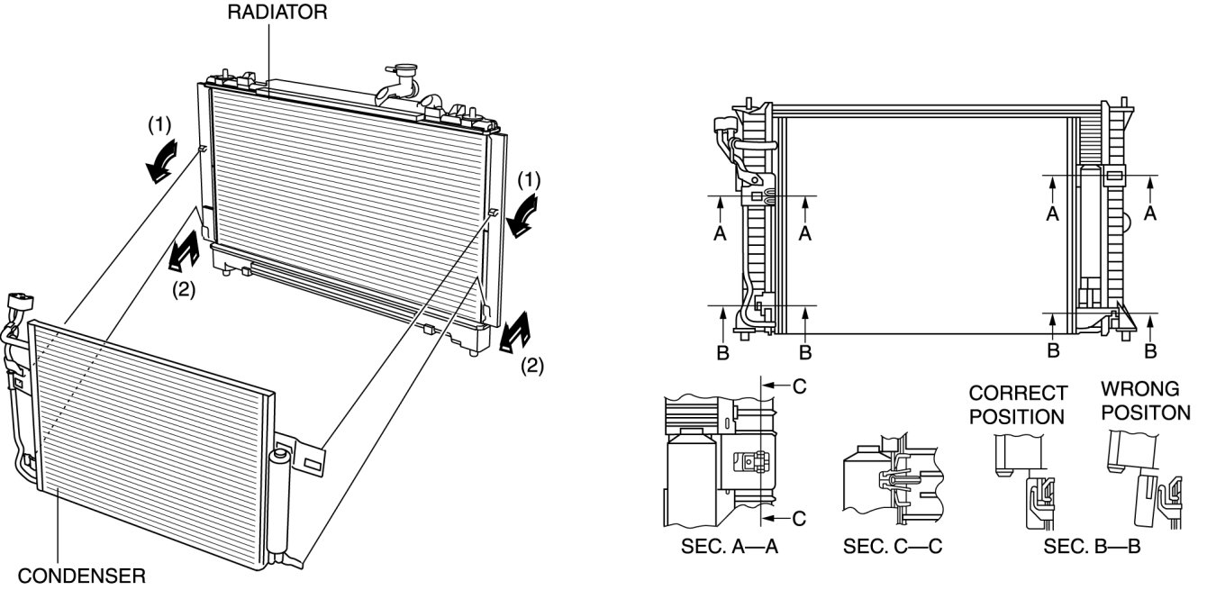 1. When install the condenser, push the upper bracket to radiator until locked.