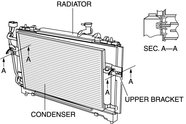 7. Remove the condenser from the radiator. Do not allow remaining compressor oil in the refrigerant line to spill.