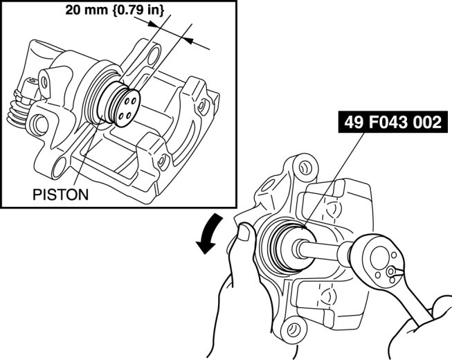 6. Rotate the SST in the direction of the arrow and push the piston completely into the caliper.
