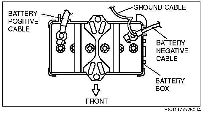 NOTE: When connecting the negative battery cable to the battery, connect the negative battery cable and the ground cable as shown in the figure.