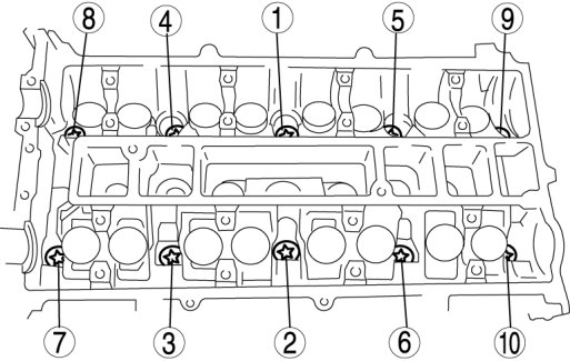 Tighten the cylinder head bolts in the order shown with the following 5 steps using the SST (49 D032 316).Tightening procedure