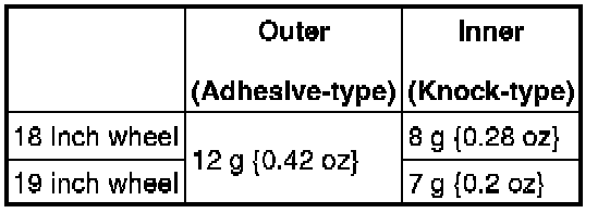 - One balance weight must not exceed 60g {2.12 oz}, and a total of tow balance weights must not exceed 100g {3.53 oz}.