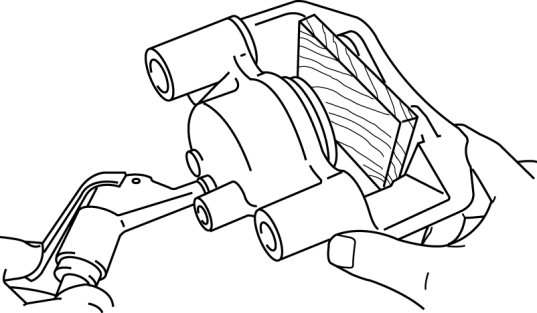 1. Insert a piece of wood in the caliper as shown in the figure, and then blow compressed air through the bleeder screw hole to remove the piston from the caliper body.