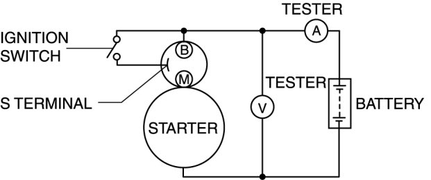 2. Connect the starter, battery, and a tester as shown in the figure.