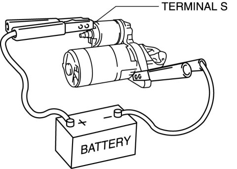 1. Verify that the starter motor pinion is extended while battery positive voltage is connected to terminal S and the starter body is grounded.