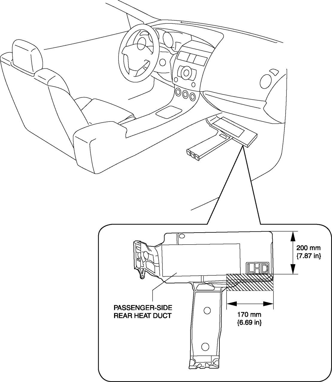 - When cutting out the portion of the passenger-side rear heat duct, do not cut it outside of the indicated area shown in the figure. Otherwise, the airflow passage could be damaged and cause the air from the heater to leak.