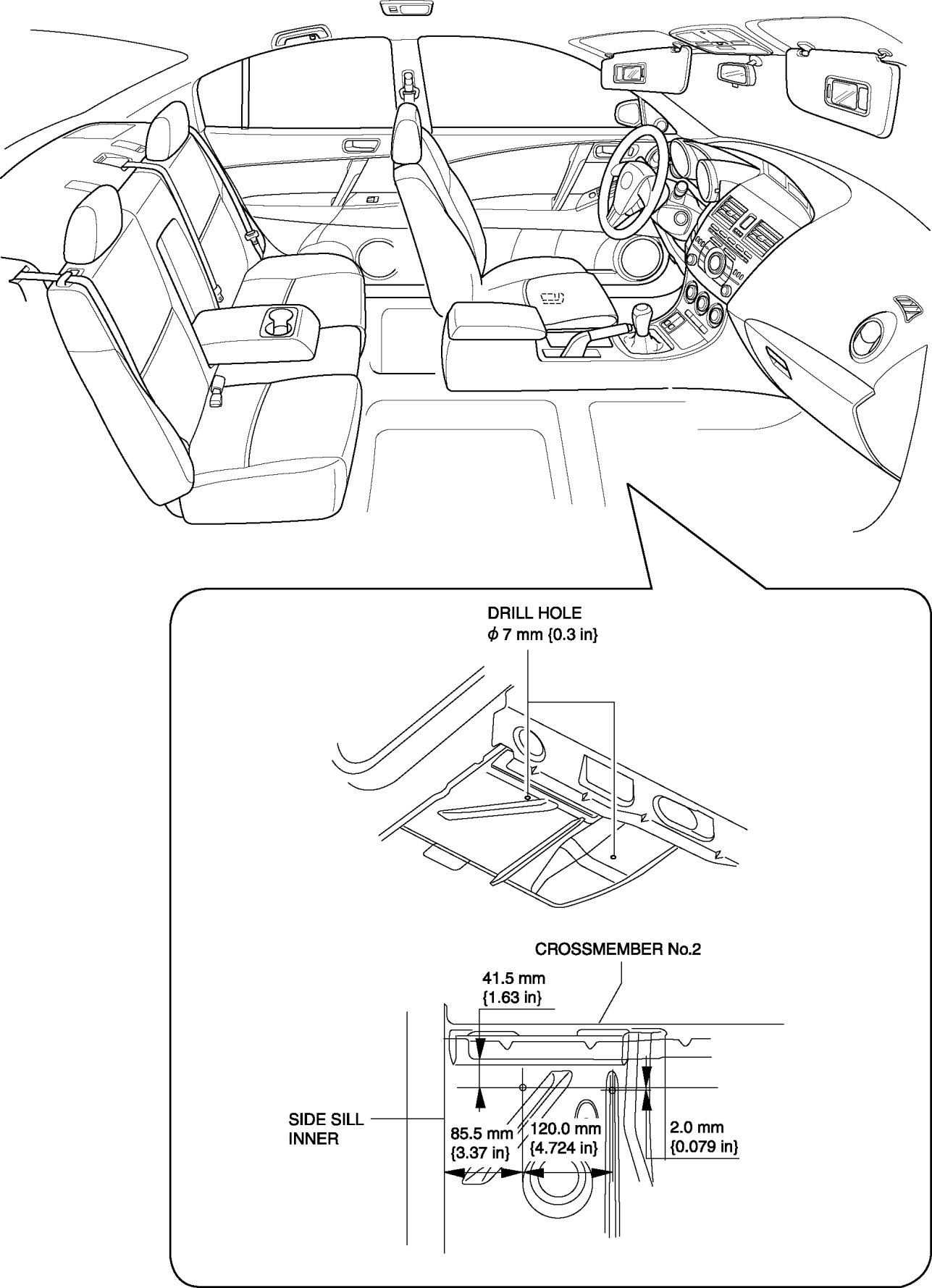 6. Drill a 7 mm {0.3 in} diameter hole at the point shown in the figure.