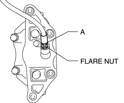 2. Tighten the flare nut while holding the brake hose at point A with a spanner or equivalent.