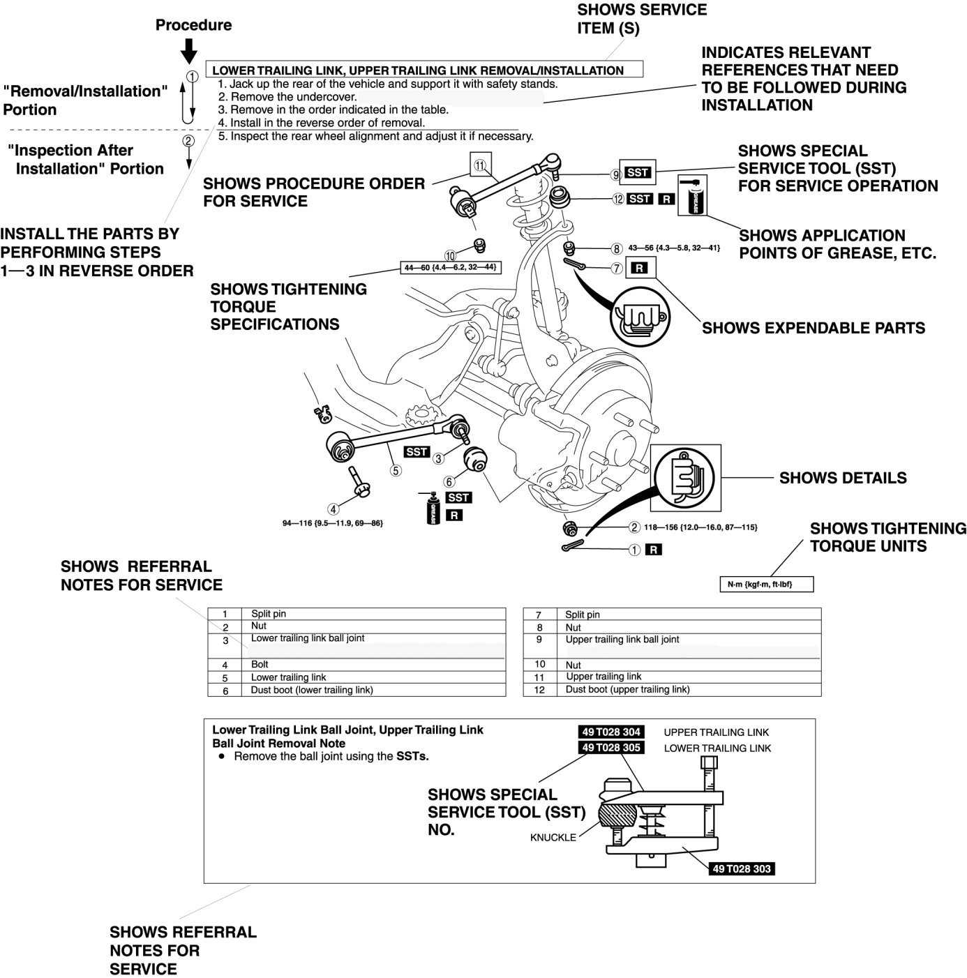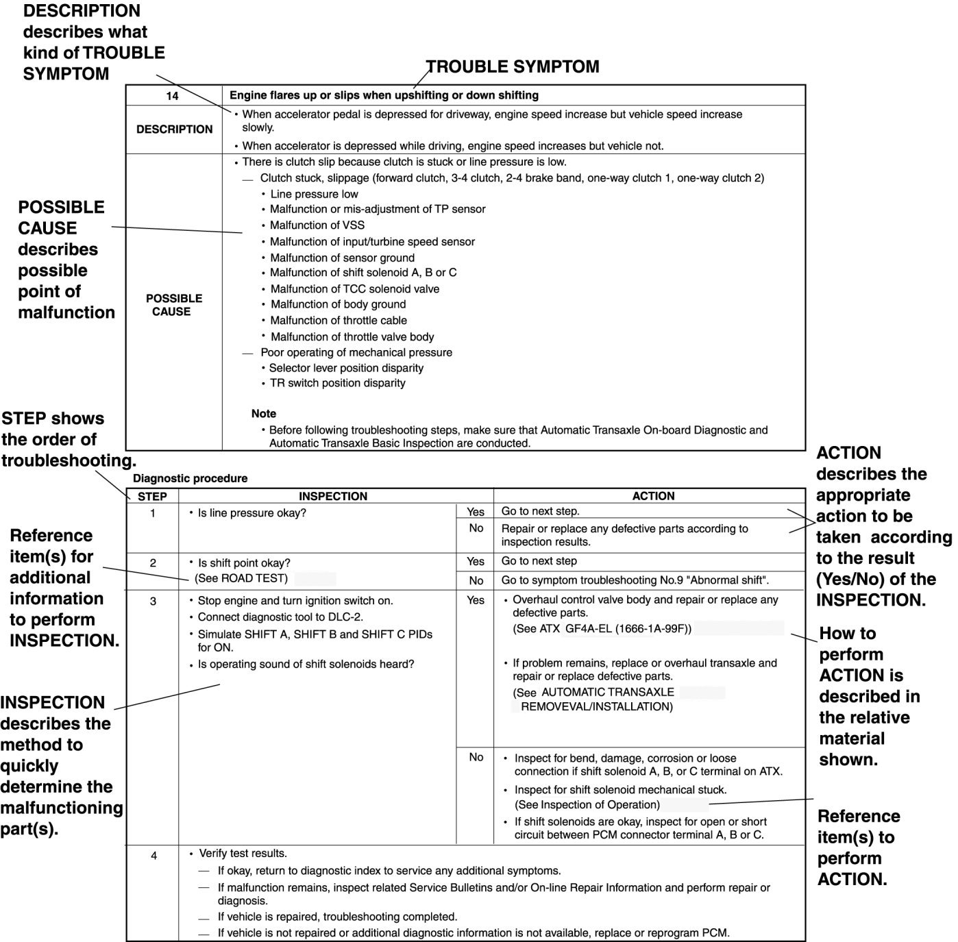 - Symptom troubleshooting shows diagnostic procedures, inspection methods, and proper action to be taken for each trouble symptom.