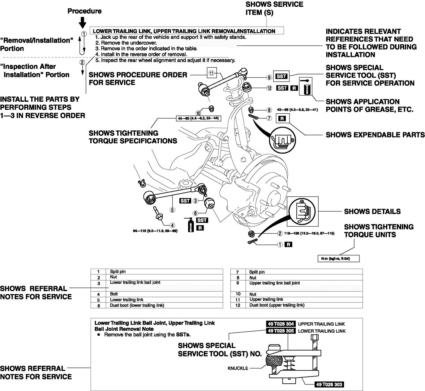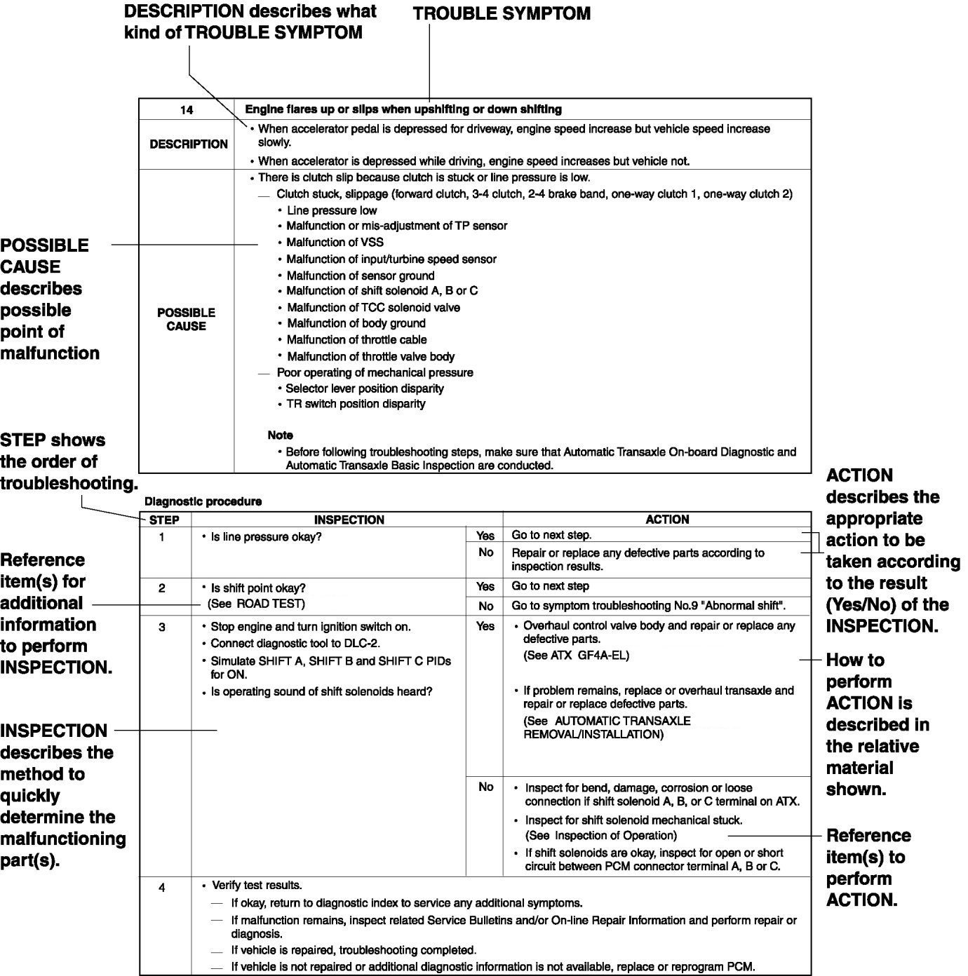 - Symptom troubleshooting shows diagnostic procedures, inspection methods, and proper action to be taken for each trouble symptom.