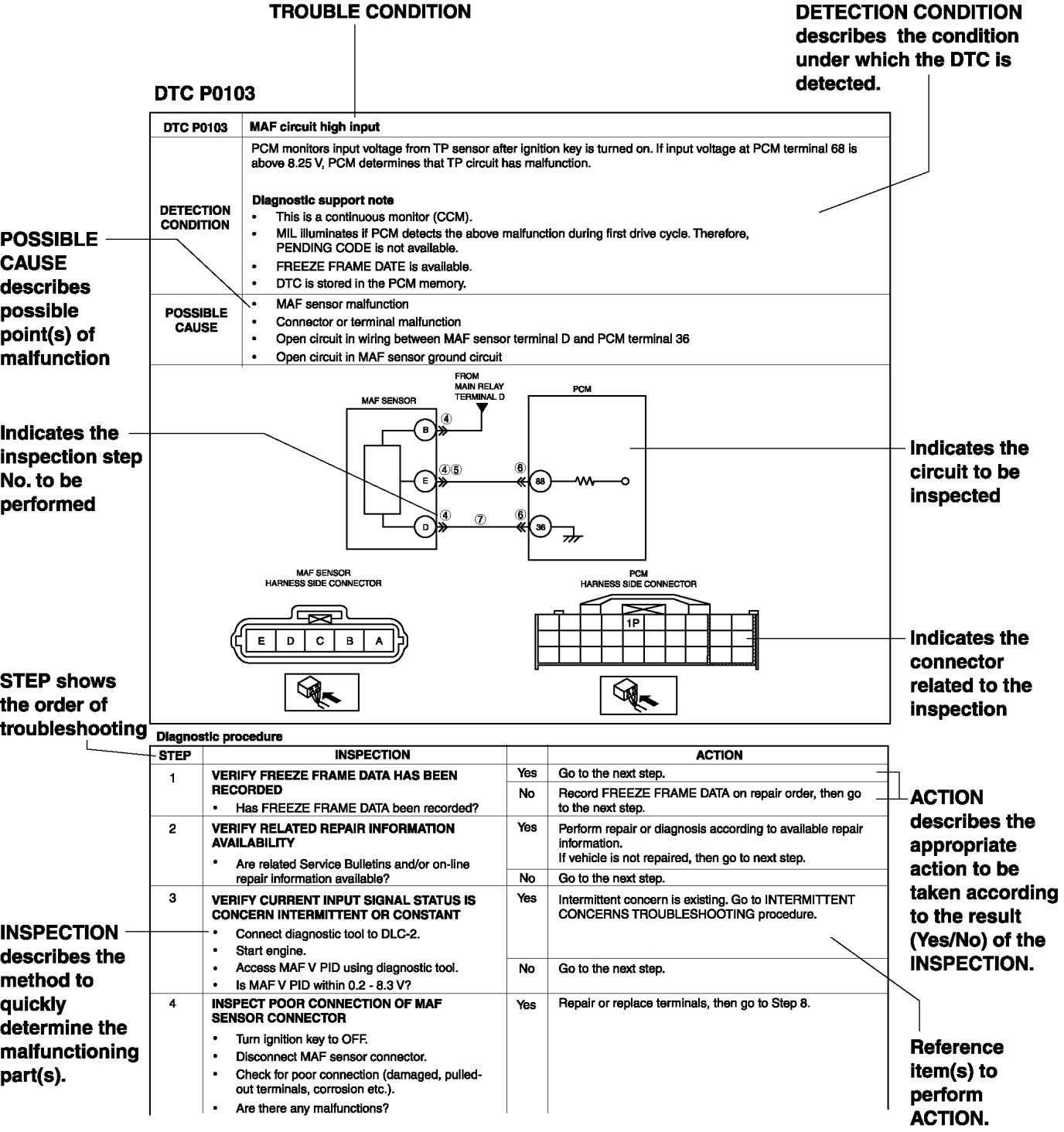 - DTC troubleshooting flow shows diagnostic procedures, inspection methods, and proper action to take for each DTC.