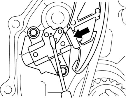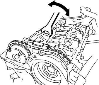 2. While moving the exhaust camshaft back and forth in the direction of the arrow using a wrench on the cast hexagon, press down the link plate of the timing chain tensioner using a precision screwdriver and release the plunger lock.