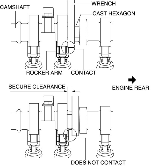 - When rotating the camshaft using a wrench on the cast hexagon, the wrench may contact the rocker arm and damage the rocker arm. When holding the camshaft on the cast hexagon, to prevent damage to the rocker arm, use the wrench at engine rear side as shown in the figure to secure a clearance between the cam.