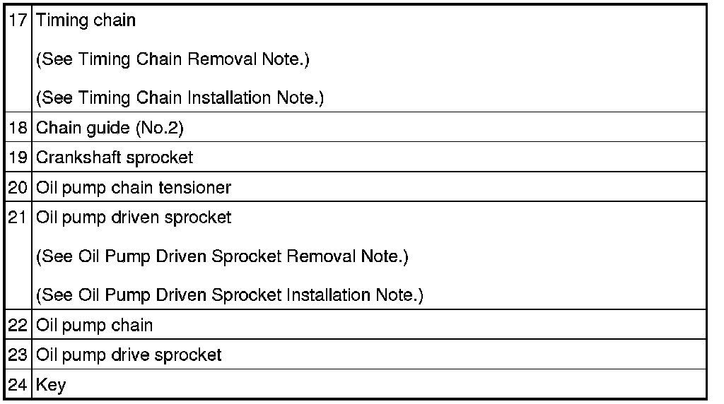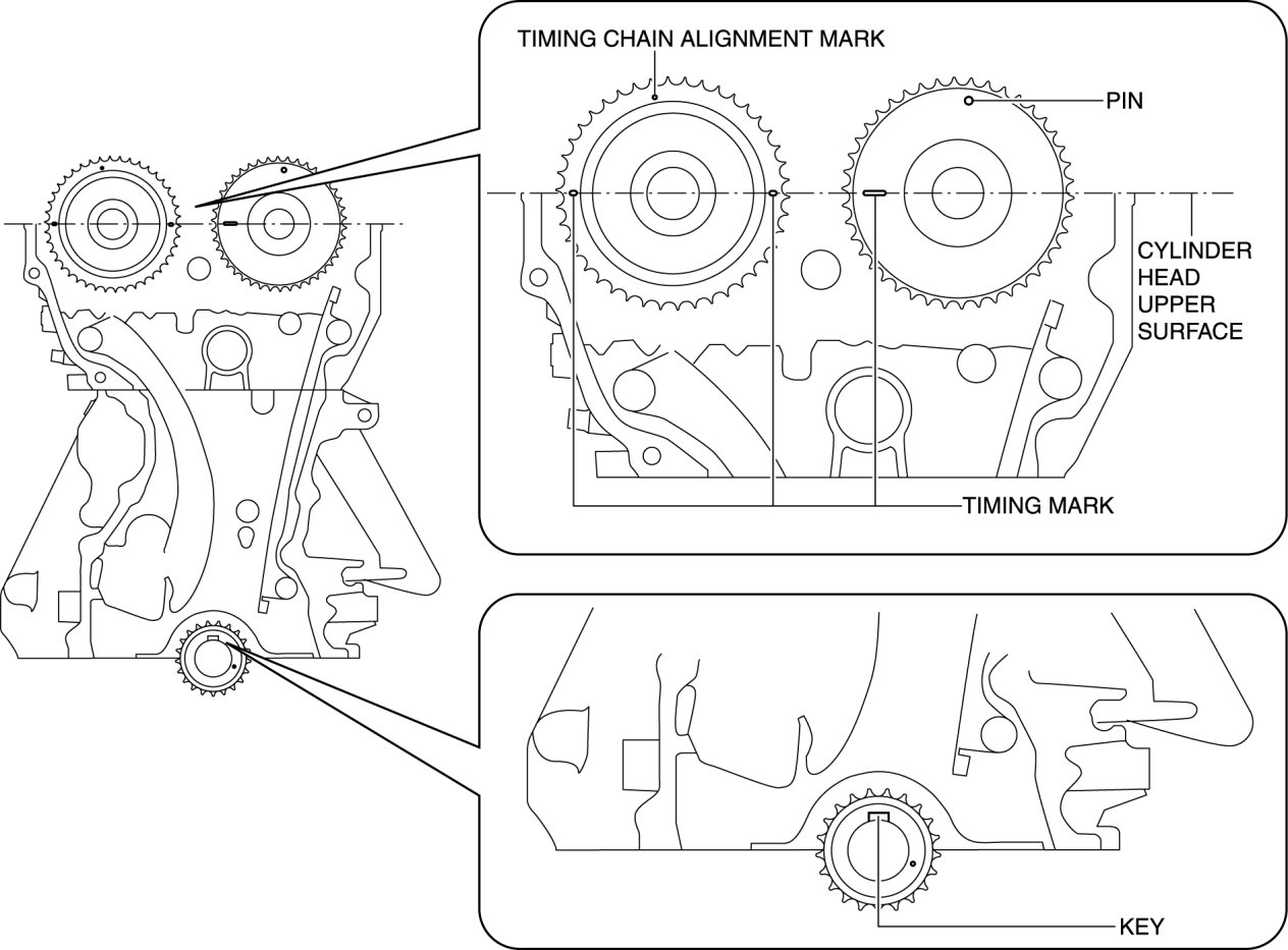 7. Verify that there is no looseness in the timing chain, and re-verify that each sprocket is in the specified location.