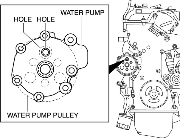 2. Align the water pump pulley hole with the water pump hole as shown in the figure.