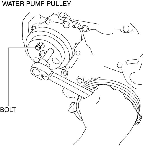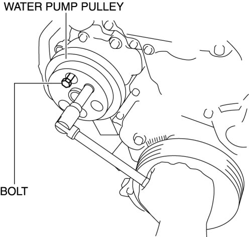 4. Completely tighten the water pump pulley bolt to the specified torque.