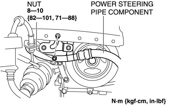 1. Remove the nut shown in the figure and set the power steering pipe component aside.