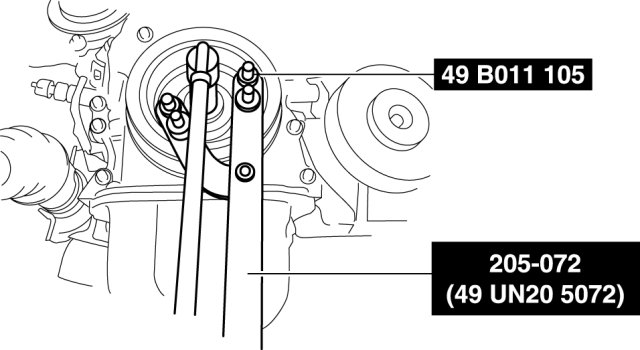 - To prevent damage to the crankshaft pulley, protect the crankshaft pulley with a clean cloth so that the bar part (205-072) of the SST does not contact the crankshaft pulley.