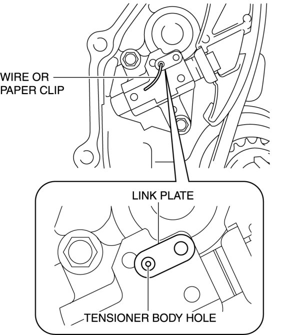 6. Insert a wire with an approx. diameter of 1.5 mm {0.059 in} or a paper clip where the link plate hole and the tensioner body hole overlap to secure the link plate and lock the plunger.