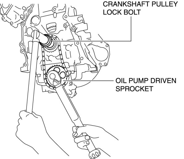 1. Temporarily assemble the crankshaft pulley lock bolt, and lock the oil pump against rotation as shown in the figure.
