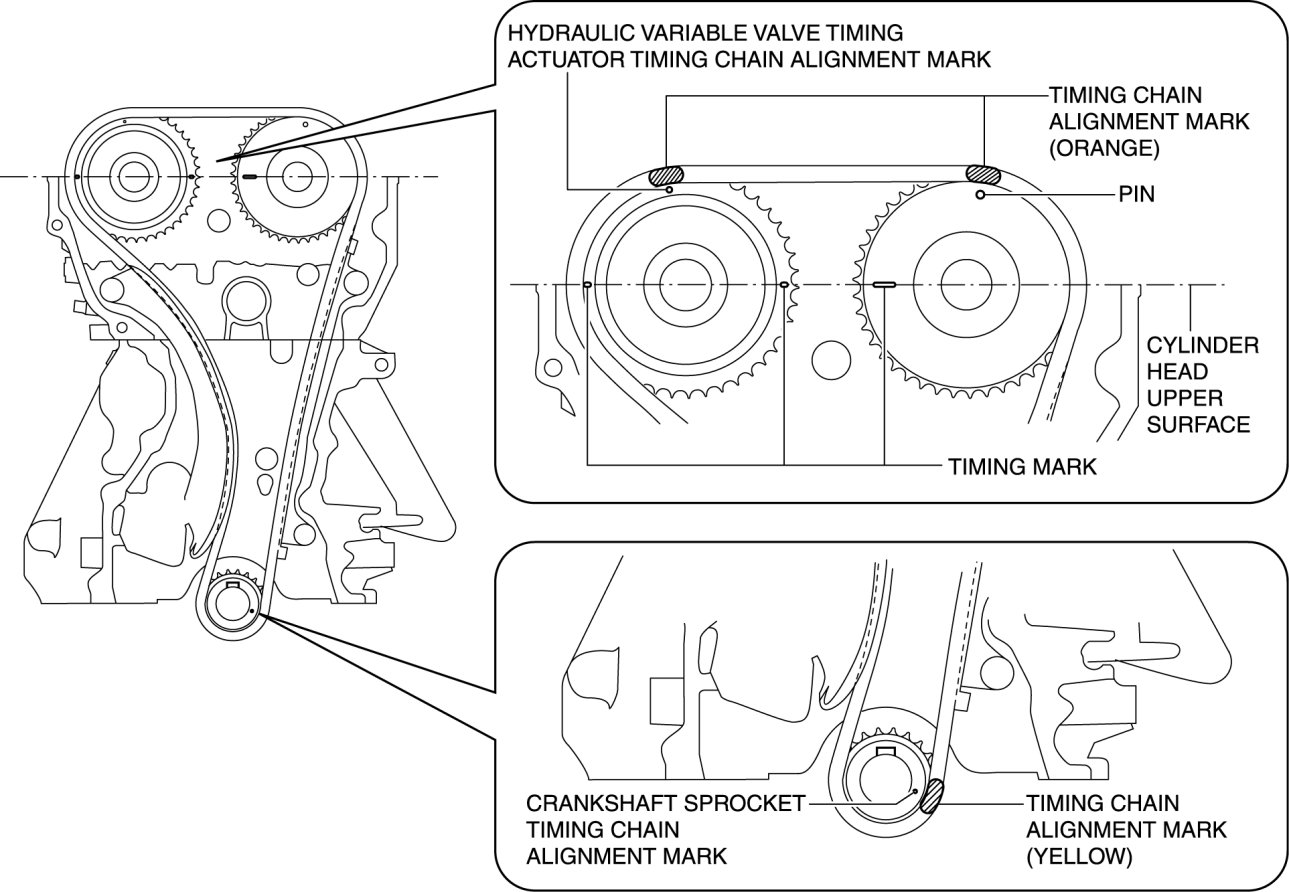 2. Install the timing chain while aligning the marks on each sprocket and the timing chain as shown in the figure.