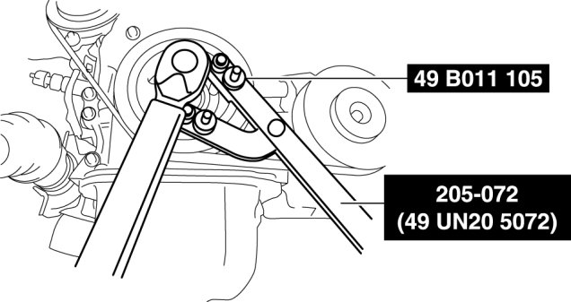 - To prevent damage to the engine front cover, be careful not to allow the tab part (49 B011 105) of the SST to get caught between the crankshaft pulley and the engine front cover.
