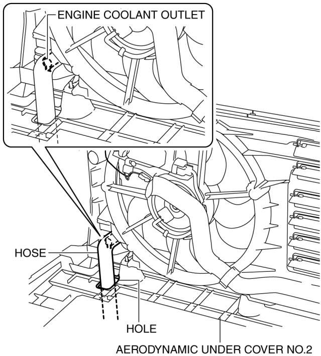 - Engine coolant drains out from the engine coolant outlet of the radiator while connecting the hose. To prevent the engine coolant from accumulating in aerodynamic undercover No.2, use rags to cover the area under the radiator drain plug and area around the service hole of aerodynamic undercover No.2 to absorb the engine coolant.