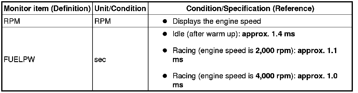 b. Quickly release the accelerator pedal (brake pedal is not depressed) and verify that the FUELPW PID is 0 msec, and 2-5 msec when the RPM PID drops below 1,200 rpm.