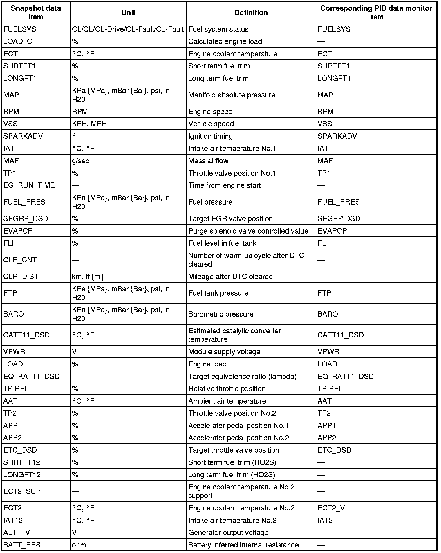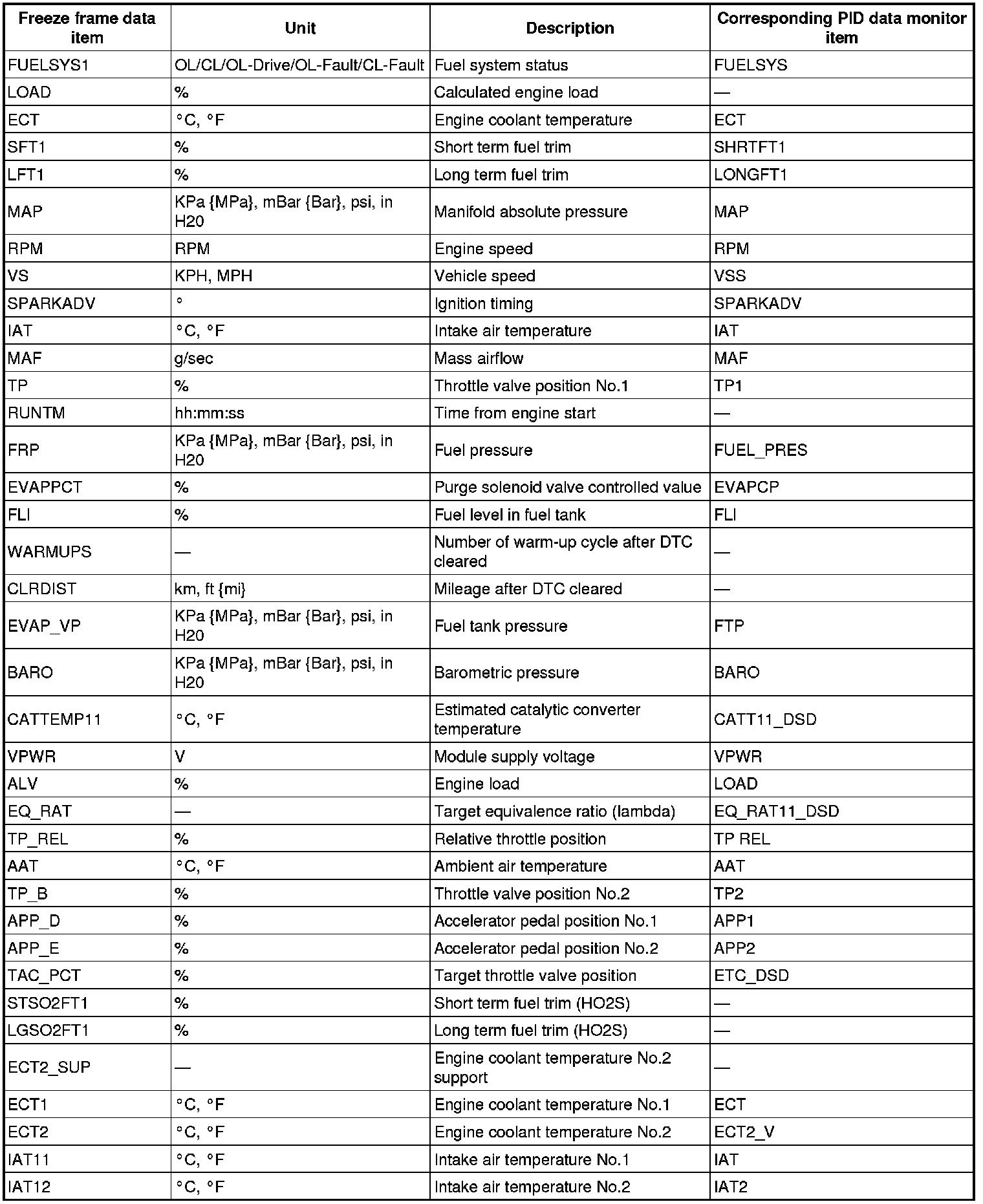 - For the freeze frame data, if there are several malfunctions in the engine control system, the data for the malfunction which occurred initially is stored. Thereafter, if a misfire or fuel injection control malfunction occurs, data from the misfire or fuel injection control malfunction is written over the initially stored data. However, if the initially stored freeze frame data is a misfire or fuel injection control malfunction, it is not overwritten.