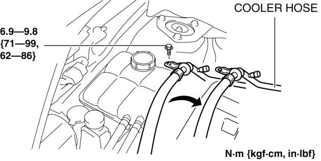 1. Remove the cooler hose bracket bolt and set the cooler hose aside.