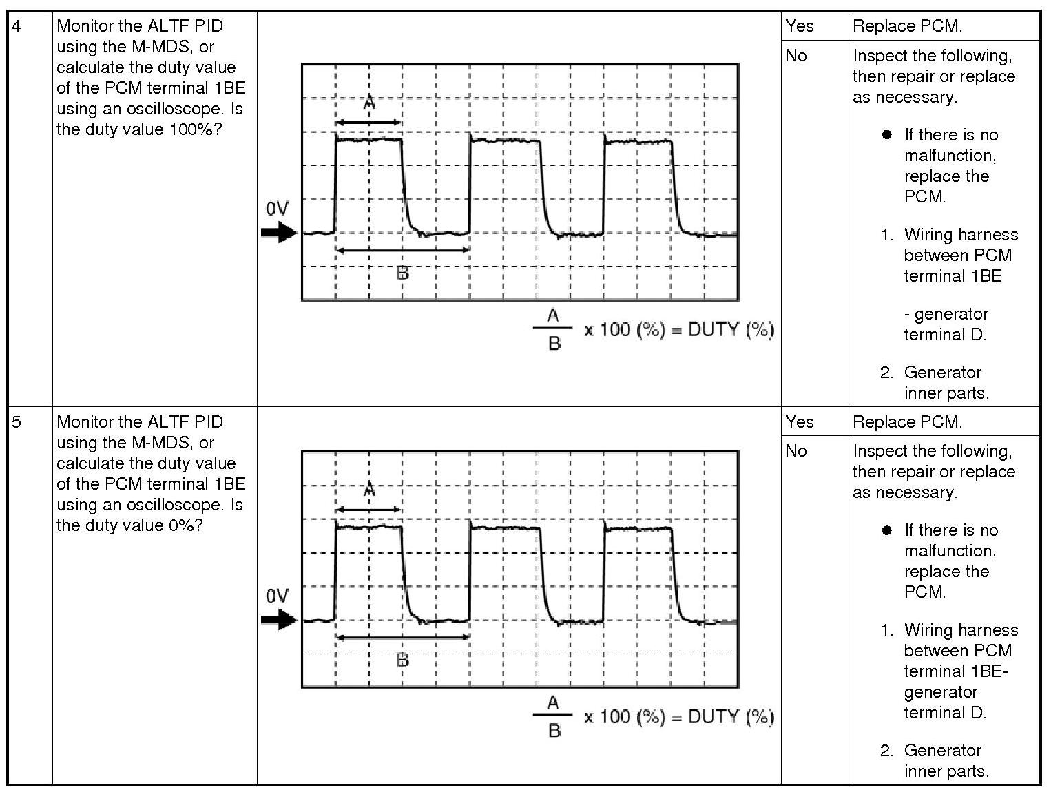 If the generator field coil duty value does not change when electrical loads (such as headlights, blower motor, rear window defroster, brake lights) are on or off, inspection with discharged battery is needed.
