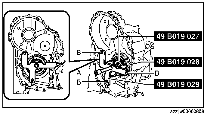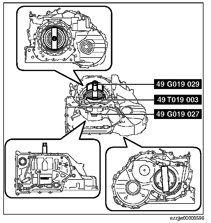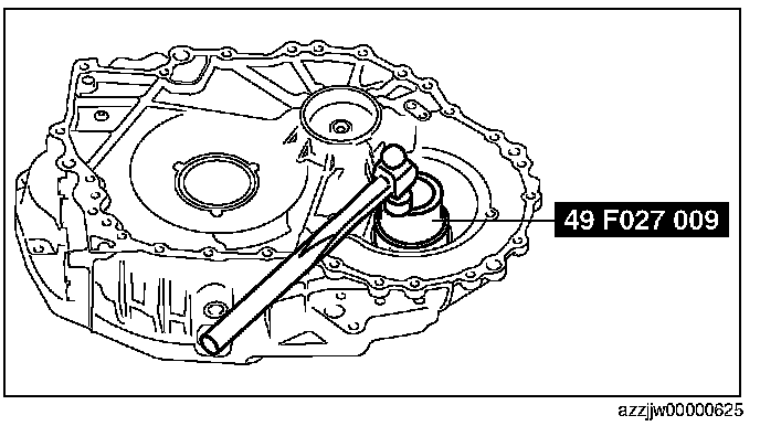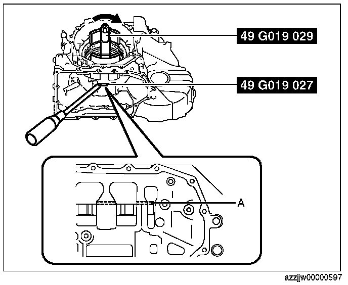 CAUTION: If the SST (49 G019 029) is tightened with excessive force, surrounding parts could be damaged. Stop tightening the SST when the snap ring groove of the transaxle case comes out.