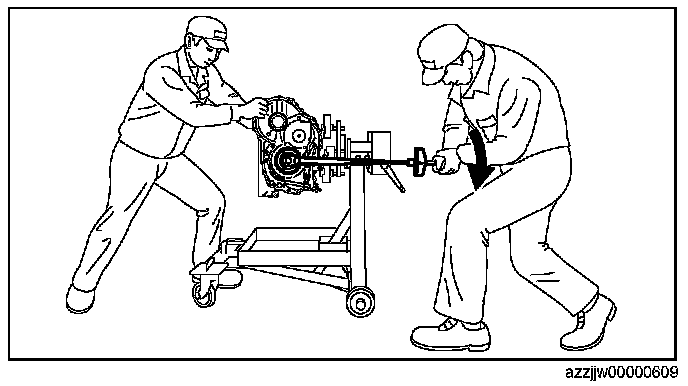 - Because the front planetary gear will drop if the end cover side is pointed downward before assembling the locknut, rotate the engine stand rotation handle, adjust so that the end cover side is situated sideways, and assemble the locknut.