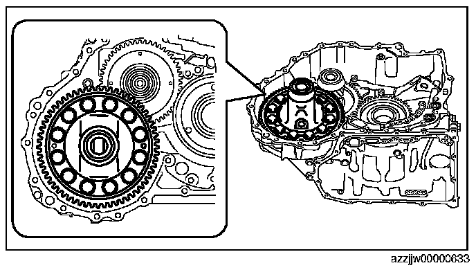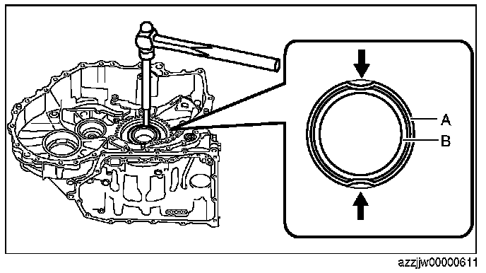 - There is a gap between the snap ring groove of the angular contact ball bearing, snap ring, and the snap ring groove of the transaxle case because the angular contact ball bearing is fixed to the transaxle case by the snap ring. The gap causes an error during the total end play measurement. Using the following procedure, the error during the total end play measurement is reduced by moving the angular contact ball bearing to the standard position.