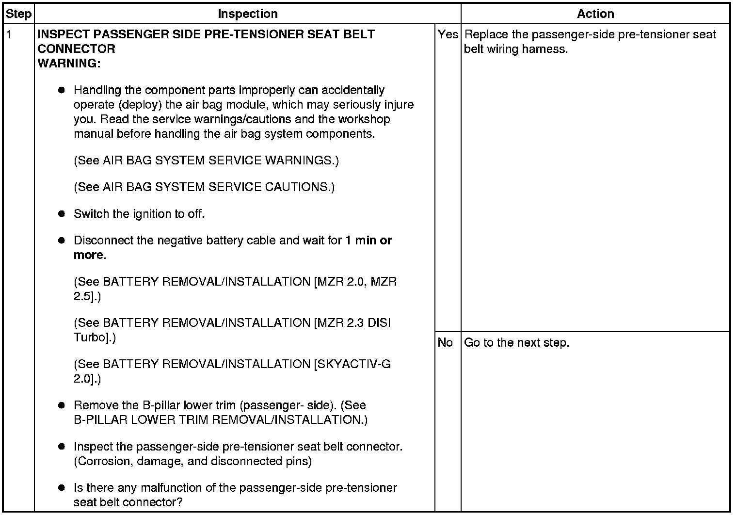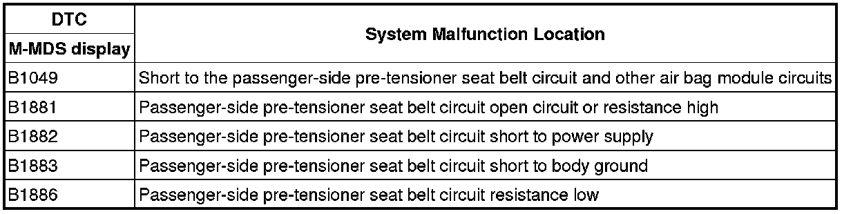- Resistance other than 1.10-5.77 ohms detected in passenger-side pre-tensioner seat belt circuit