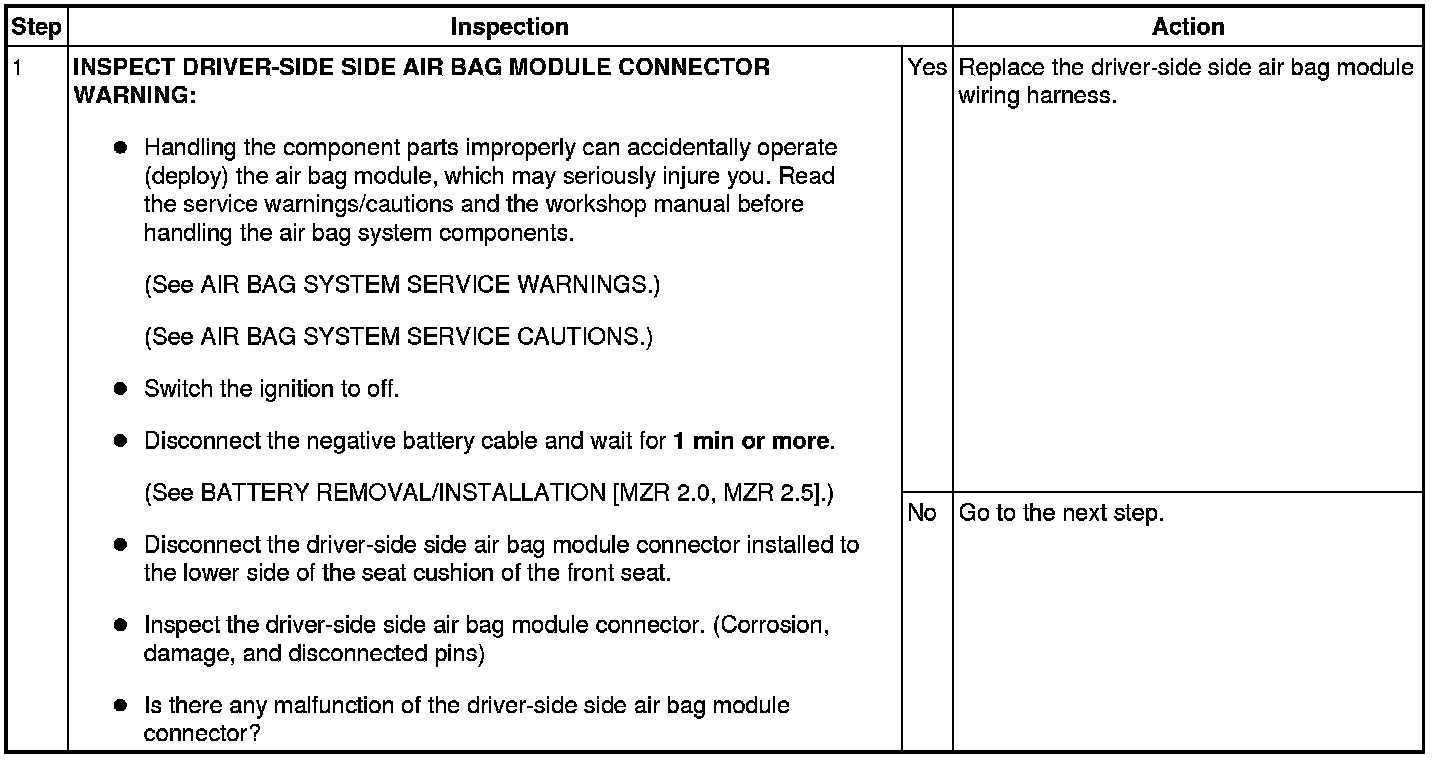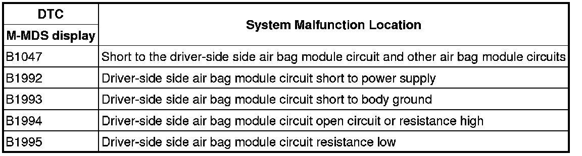 - Resistance other than 1.10-9.64 ohms is detected in driver-side side air bag module circuit