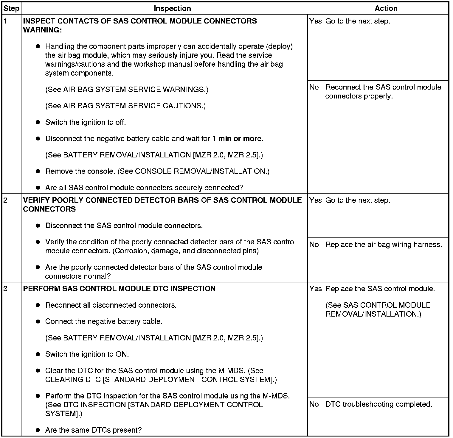 - No continuity between poorly connected detector bar terminals of the SAS control module
