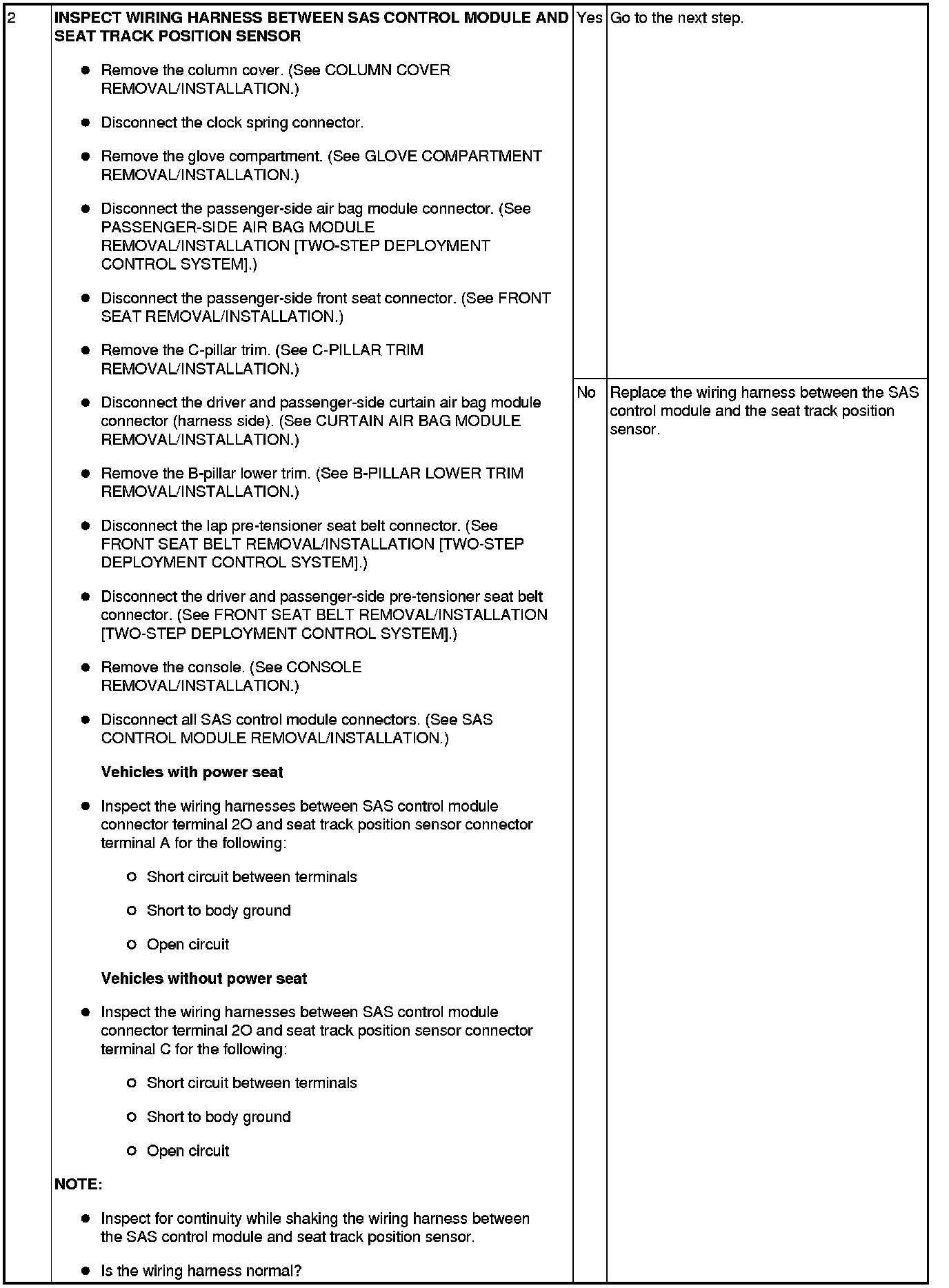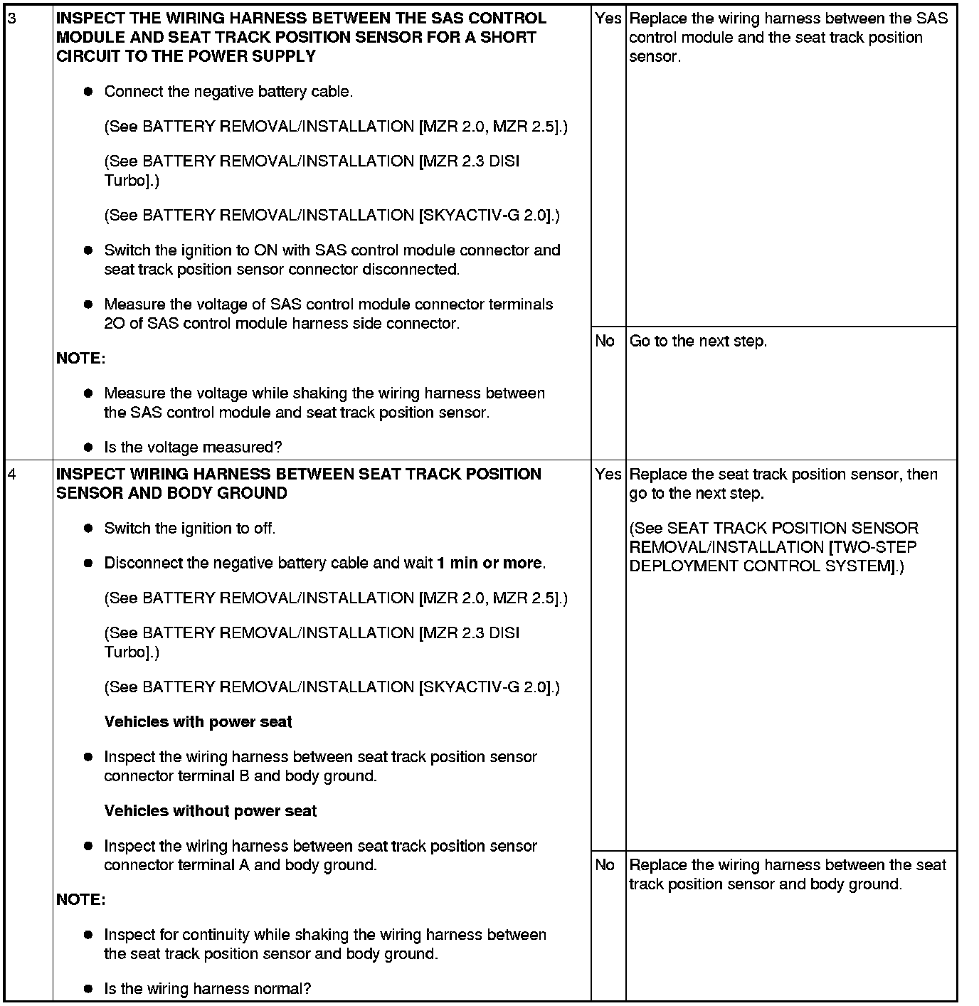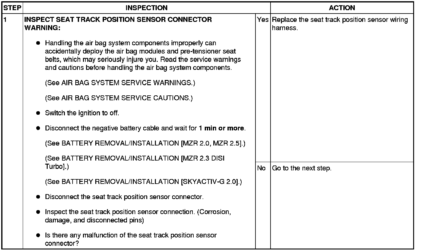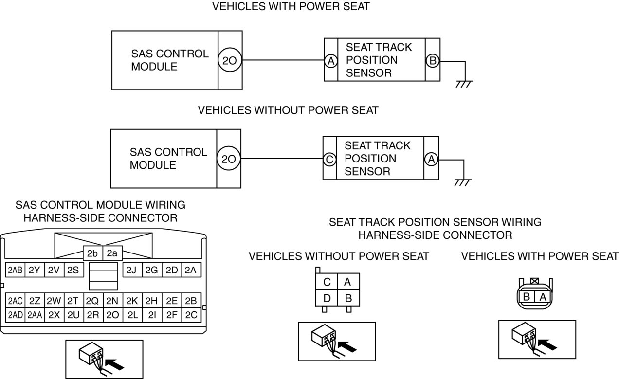 - Open or short circuit or short to ground or short to power supply in wiring harness between seat track position sensor and SAS control module.
