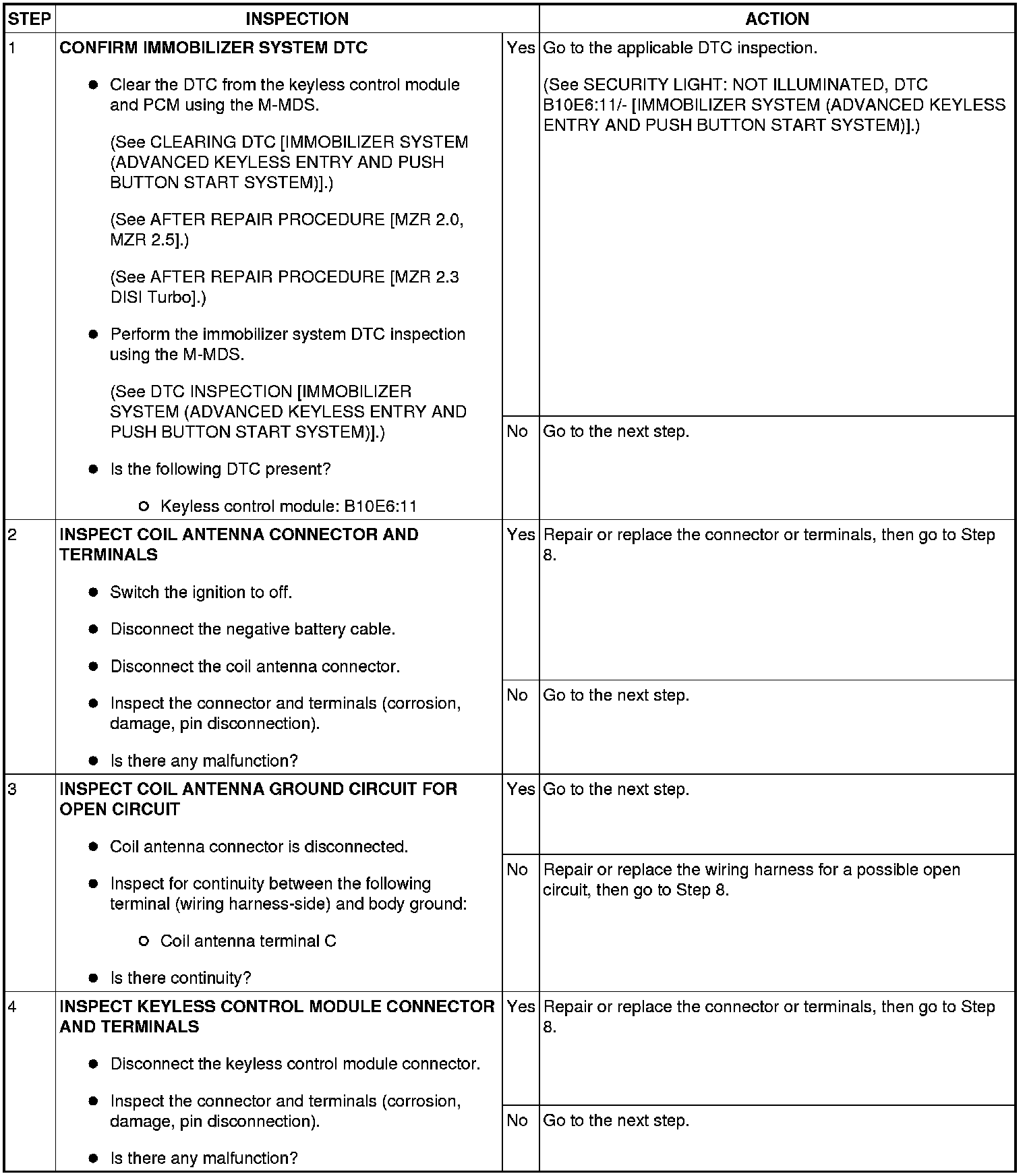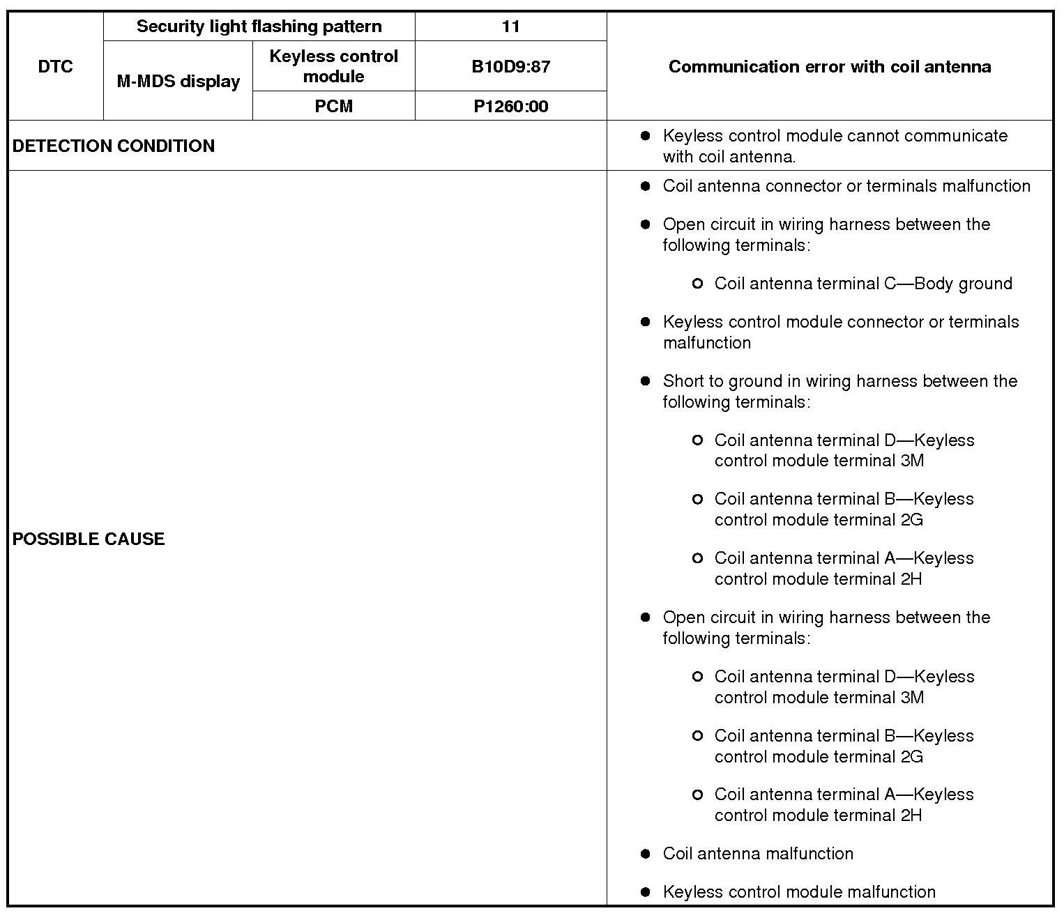 SECURITY LIGHT: 11, DTC: B10D9:87 / P1260:00 [IMMOBILIZER SYSTEM (ADVANCED KEYLESS ENTRY AND PUSH BUTTON START SYSTEM)]