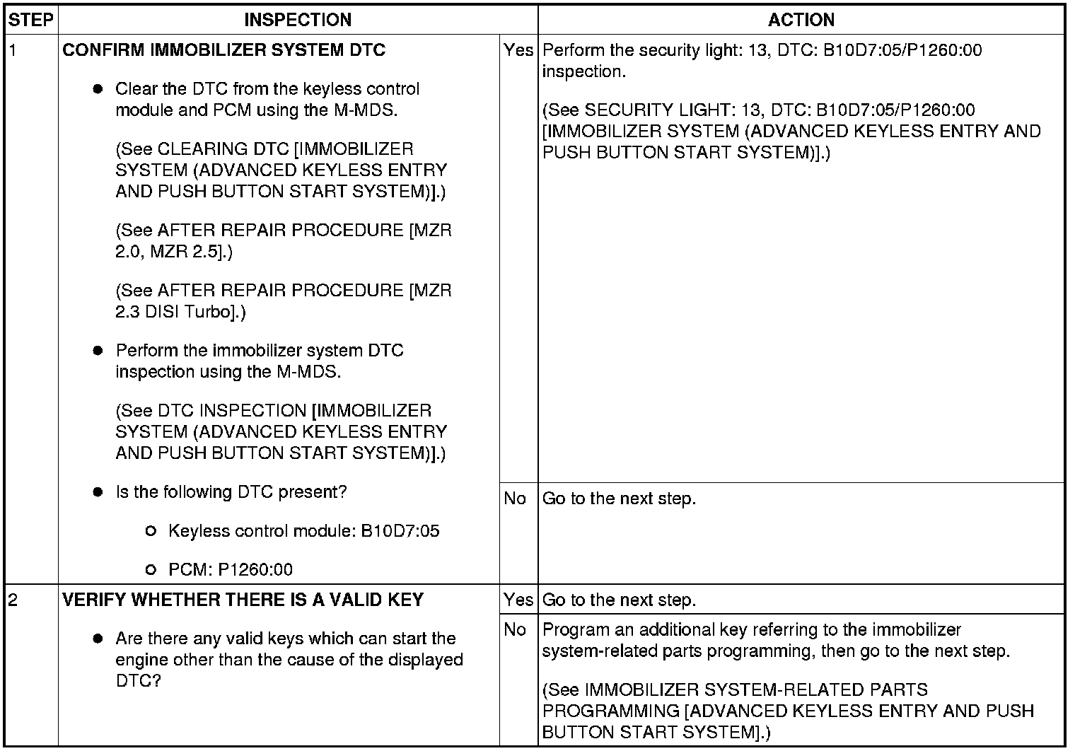 SECURITY LIGHT: 13, DTC: B10D7:94 / P1260:00 [IMMOBILIZER SYSTEM (ADVANCED KEYLESS ENTRY AND PUSH BUTTON START SYSTEM)]
