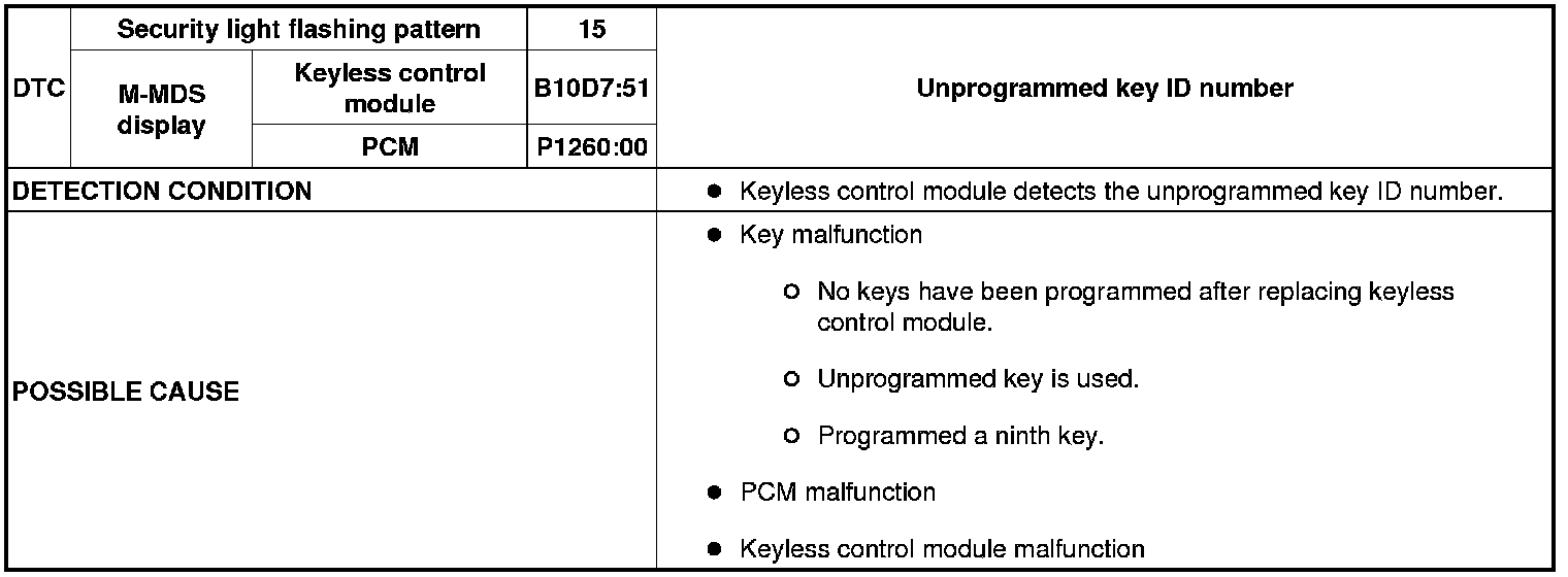 SECURITY LIGHT: 15, DTC: B10D7:51 / P1260:00 [IMMOBILIZER SYSTEM (ADVANCED KEYLESS ENTRY AND PUSH BUTTON START SYSTEM)]