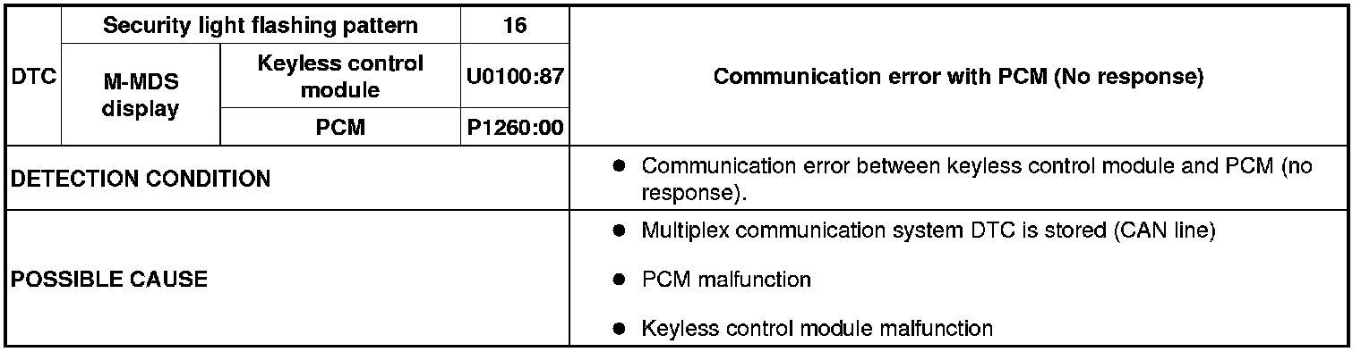 SECURITY LIGHT: 16, DTC: U0100:87 / P1260:00 [IMMOBILIZER SYSTEM (ADVANCED KEYLESS ENTRY AND PUSH BUTTON START SYSTEM)]