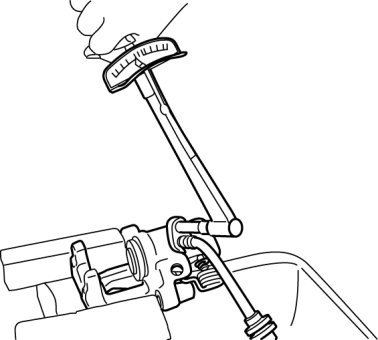 - If the brake hose is installed to the caliper on the vehicle, the tool cannot be installed correctly resulting in brake fluid leakage due to improper installation. Therefore, remove the caliper and brake hose as a single unit when removing the caliper or brake hose, and tighten the brake hose to the caliper to the specified torque, then install the caliper and brake hose as a single unit when installing to the vehicle.