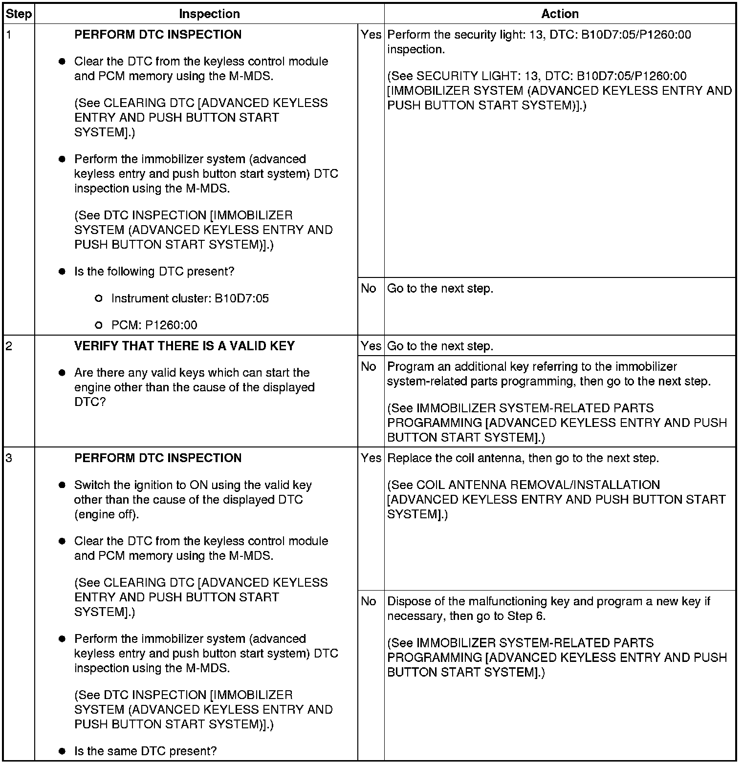 SECURITY LIGHT: 13, DTC: B10D7:94/P1260:00 [IMMOBILIZER SYSTEM (ADVANCED KEYLESS ENTRY AND PUSH BUTTON START SYSTEM)]