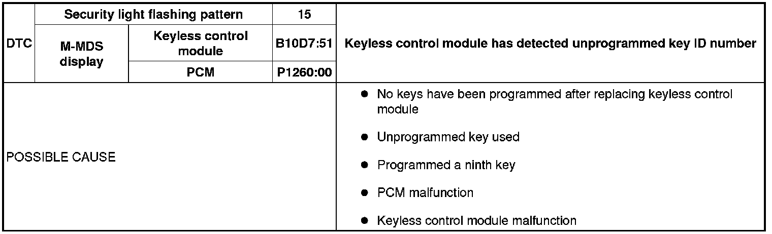 SECURITY LIGHT: 15, DTC: B10D7:51/P1260:00 [IMMOBILIZER SYSTEM (ADVANCED KEYLESS ENTRY AND PUSH BUTTON START SYSTEM)]