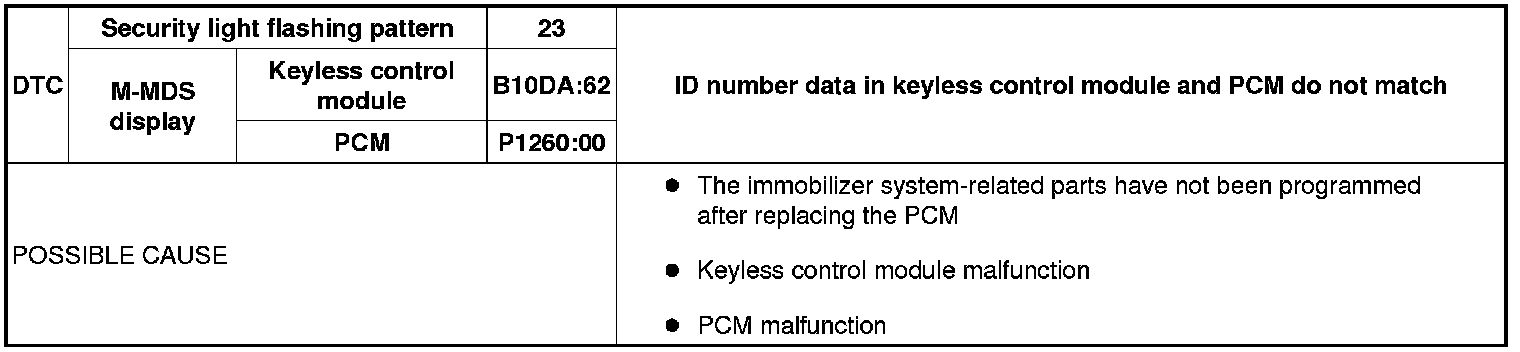 SECURITY LIGHT: 23, DTC: B10DA:62/P1260:00 [IMMOBILIZER SYSTEM (ADVANCED KEYLESS ENTRY AND PUSH BUTTON START SYSTEM)]