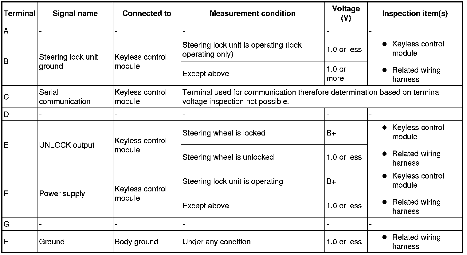 - If the system does not work normally even though the inspection items are normal, replace the steering lock unit.