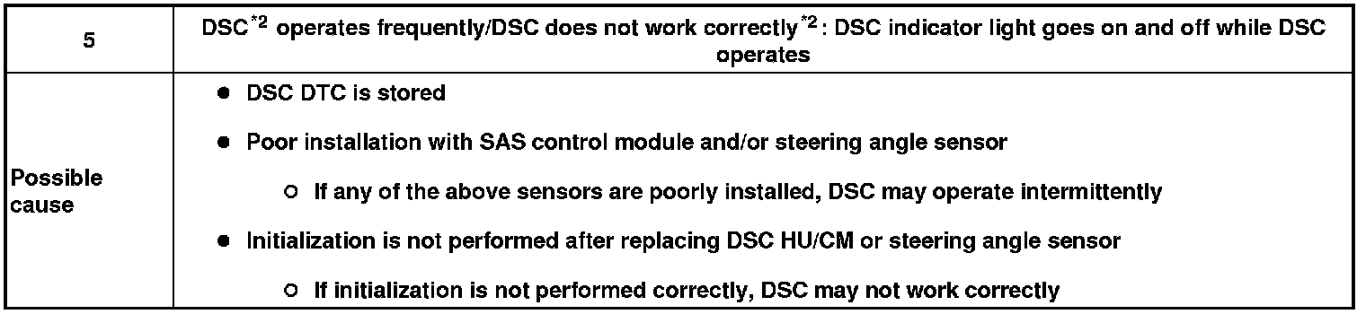 NO.5 DSC*2 OPERATES FREQUENTLY/DSC DOES NOT WORK CORRECTLY *2: DSC INDICATOR LIGHT GOES ON AND OFF WHILE DSC OPERATES [DYNAMIC STABILITY CONTROL (DSC)]